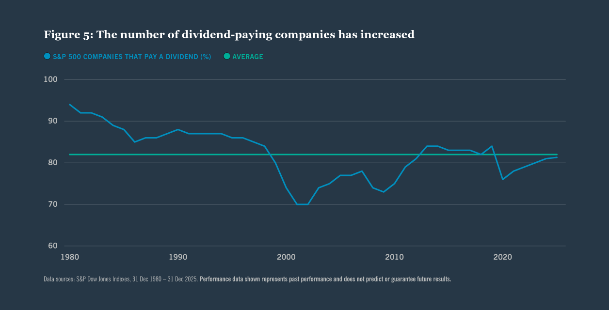 We believe many companies are well positioned to continue increasing their dividends over the long term. Within the U.S., corporate balance sheets remain healthy, the consumer continues to be resilient and earnings growth is expected to accelerate further in 2026. According to FactSet, the S&P 500 dividends per share grew by 4% in 2025 and consensus estimates expect 5% growth in 2026.