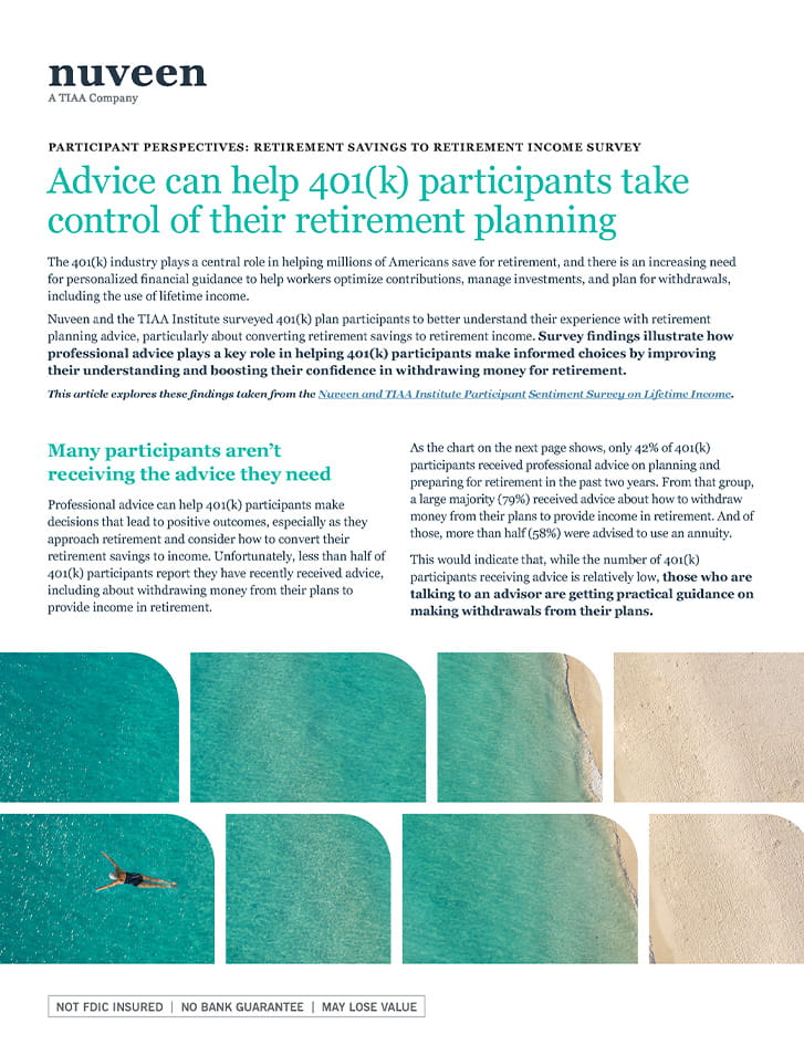Nuveen and the TIAA Institute surveyed 401(k) plan participants to better understand their experience with retirement planning advice, particularly about converting retirement savings to retirement income. Survey findings illustrate how professional advice plays a key role in helping 401(k) participants make informed choices by improving their understanding and boosting their confidence in withdrawing money for retirement.
