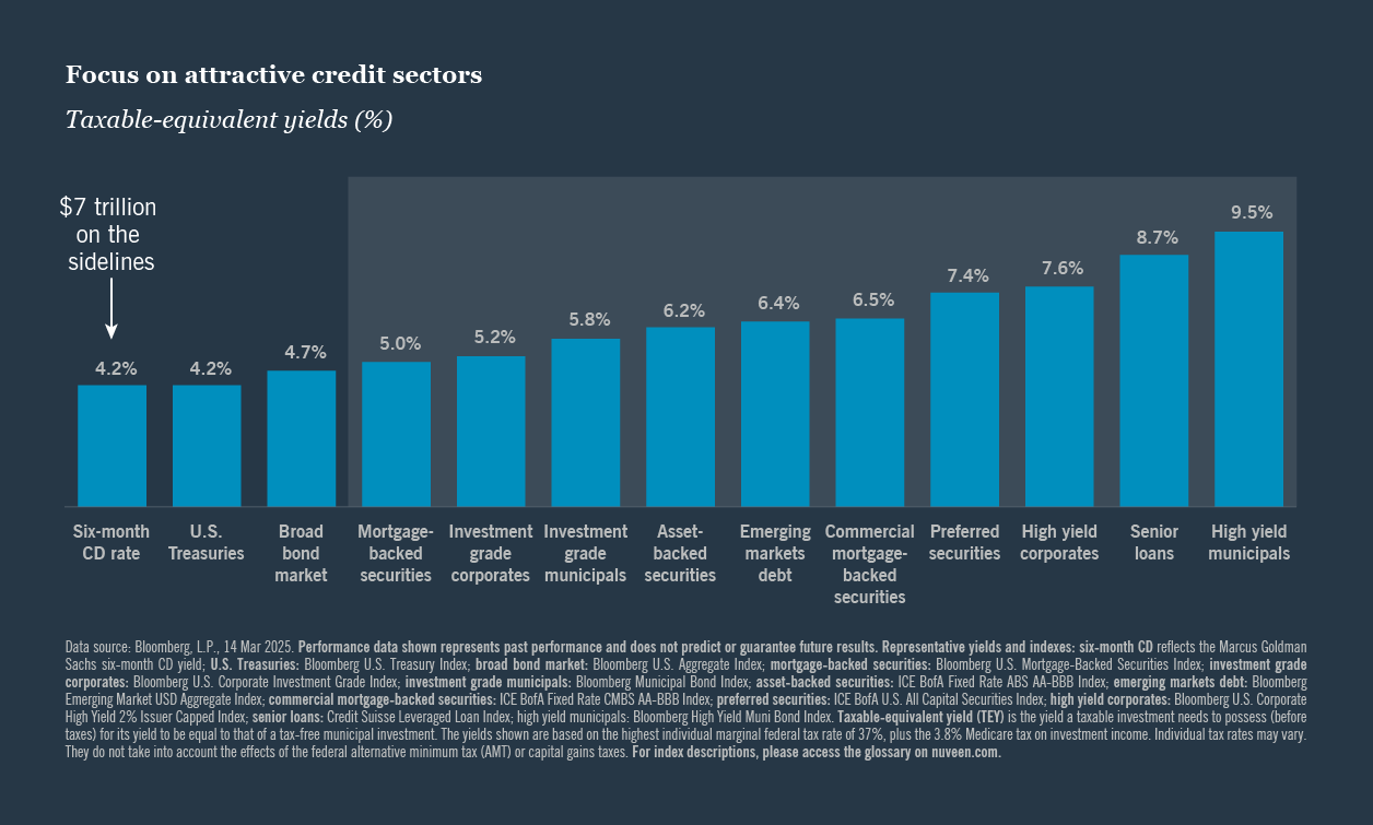 So far, these views have mostly paid off. While credit spreads have widened, interest rates have declined, supporting global bond markets. We maintain our view that a diversified bond portfolio balancing rate and credit sensitivity will be resilient in a higher-for-longer rate environment. But selectivity is critical. For example, we are bullish on U.S. corporate credit (high yield and loans) but prefer relatively higher quality issuers. In the securitized space, we like off-benchmark issues such as data center asset-backed and non-agency commercial mortgage-backed securities that offer compelling risk-adjusted spreads. And we favor private credit in the middle market, particularly more conservative structures with lower leverage and stronger covenants. - Municipals are still the borrower of choice for investors in it for the duration.